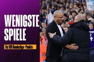 孔帕尼执教德甲40场获得100分,德甲历史仅瓜帅更快达成100分